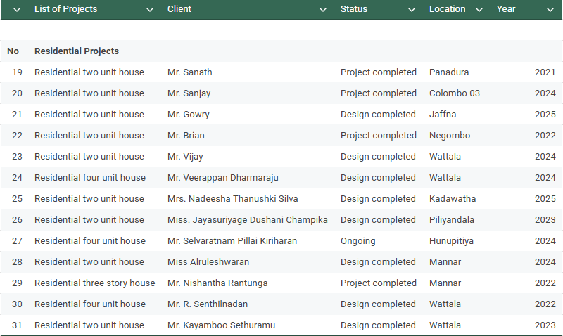 Residential House Residential House, Wattala Mr Vijay Wattala, Sri Lanka View Project Residential House, Negombo Mr Brian Negombo, Sri Lanka View Project Residential House, Jaffna Mr Gowry Jaffna, Sri Lanka View Project Residential House, Panadura Mr Sanath Panadura, Sri Lanka View Project Residential House, Colombo 03 Mr Sanjay Colombo 03, Sri Lanka View Project
